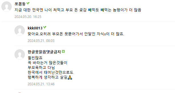 그러면서 “밖에서 자식들이 용돈 줬다고 자랑하시는 노인 분들, 그것만큼 철없어 보이고 모자라 보이는 거 없다”며 “자식들이 정말 행복하게 자신들의 삶을 살아갈 수 있도록 하는 건 부담되지 않게 내 노후 내가 잘 챙기며 손 벌리지 않는 것이다. 돈 줘도 거절할 줄 아는 참 어른이 되시길 바란다”며 글을 맺었습니다.