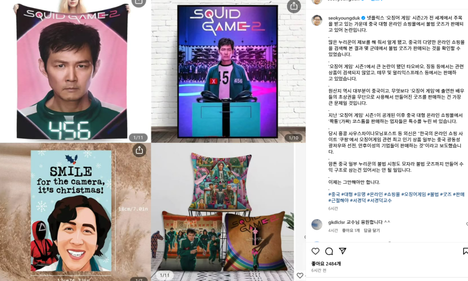 서경덕 성신여대 교수도 자신의 인스타그램을 통해 “중국의 다양한 온라인 쇼핑몰을 검색해 본 결과 몇 군데에서 불법 굿즈가 판매되는 것을 확인할 수 있었다”고 지적했습니다.“배우들의 초상권을 무단으로 사용해서 만들어진 굿즈를 판매하는 게 가장 큰 문제일 것”이라고 했습니다. 그러면서 “중국 일부 네티즌의 불법 시청도 모자라 불법 굿즈까지 만들어 수익 구조로 삼는 건 있어서는 안 될 일”이라며 “이제는 그만해야만 한다”라고 덧붙였습니다.