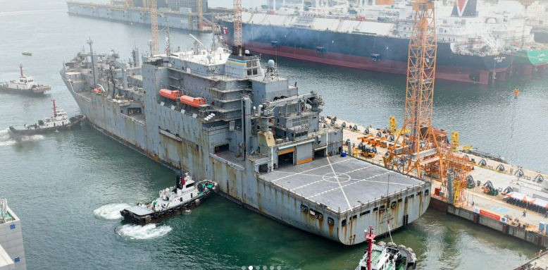 미국 해군 군수지원함 '월리 쉬라(Wally Schirra)'호가 한화오션 거제사업장에 입항하여 정비를 시작했습니다. 이 함정은 탄약, 식량, 수리부품, 연료 등을 다른 함정에 보급하는 역할을 합니다. 배수량은 약 4만t급으로 전장 210m, 전폭 32.2m에 달하는 함정입니다.