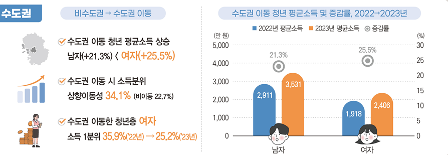 2022년에 비수도권에 있다가 2023년 수도권으로 일터를 옮긴 청년들의 평균 소득은 약 3000만원에 가까웠고 전년 대비 22.8% 증가했습니다. 1년 사이에 소득이 5분의 1 이상 늘어난 셈인데 같은 기간 비수도권에서 계속 일한 청년들의 소득 증가율은 12% 수준에 머물렀습니다. 이동 여부만으로 소득 증가 격차가 두 배 가까이 난다는 사실은 청년들에게 이동이 선택이 아니라 생존 전략이 되고 있음을 보여줍니다.