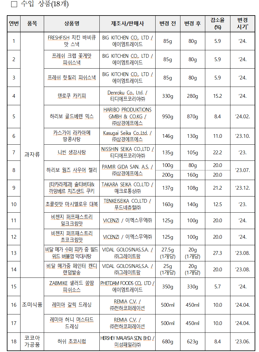 한국소비자원은 모니터링 결과 확인된 용량 변경 상품의 정보를 참가격 웹사이트를 통해 공표하고 해당 상품의 제조업체 및 수입판매업체에는 자사 홈페이지 또는 쇼핑몰 등에 정보를 제공하도록 권고했다고 밝혔습니다.