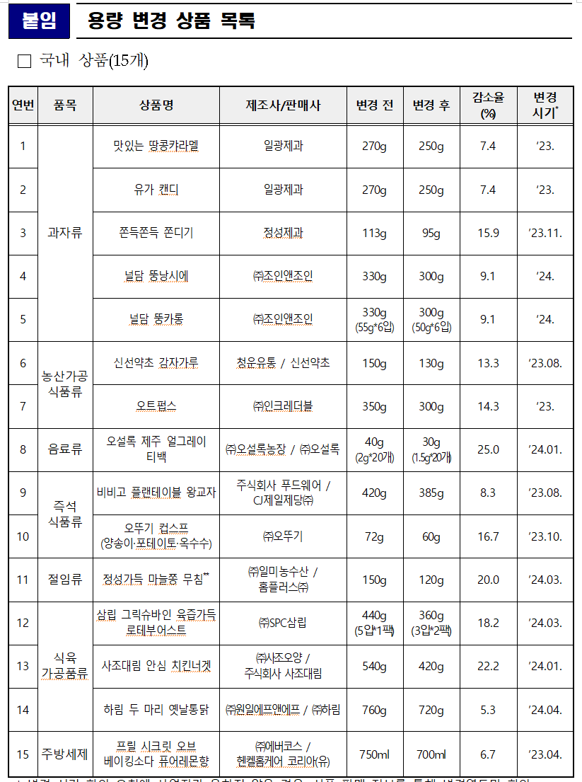 한편, 오는 8월 3일부터는 국민 실생활에 밀접한 품목들을 제조하는 사업자(주문자 상표 부착 또는 제조업자 개발 생산 상품에 대해서는 그 주문자)가 소비자에게 알리지 아니하고 용량 등을 축소하는 경우에는 「부당한 소비자거래행위 지정 고시」에 따라 과태료 부과대상이 된다고 합니다.