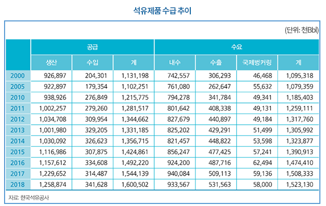 한국의 석유수급 추이를 살펴보면 양적으로 팽창하면서 질적인 변화도 뒤따랐다. 경제성장에 따라 주종 에너지원인 석유 소비가 늘어나는 과정에서 삶의 질 향상에 따른 연료의 고급화가 진행되어온 것이다. 국내 석유 소비시장의 변화 패턴을 요약해보면 ①석유제품의 고품질 경질화 추세 ②연료소비 우위에서 원료소비 우위로 전환 ③석유제품의 수출시장 확대라고 말할 수 있다. 자동차 등록대수의 증가에 따라 수송용 연료 소비는 꾸준히 상승세가 유지되어온 반면, 가정•상업용과 산업 및 발전용 연료는 전반적으로 타 연료로 전환되는 추세에 있다.