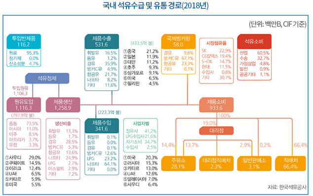 최근에는 나프타에 이어서 LPG를 원료로 사용하는 프로필렌 생산이 본격화되고 있다. 즉 석유화학산업에서 프로필렌 생산설비인 PDH(Propane De-Hydrogenation)의 증설에 나서고 있다. 2018년 석유소비가 전년대비 0.7% 감소했음에도 LPG소비는 전년대비 4.0%의 높은 증가율을 보였다. 이는 LPG차량의 감소로 수송부문에서 6.2% 감소했음에도 석유화학원료로 소비가 큰 폭으로 증가하였기 때문이다. 또한 벙커C유는 선박용 및 산업용에서 큰 폭으로 감소하여 전년대비 5.7% 감소하였다. 2018년 석유제품별 소비점유율을 살펴보면, 나프타가 48.3%로 최대 소비제품이고 경유가 17.9%, LPG 11.7%로 기록되었다. 이어서 휘발유 8.5%, 항공유 4.3%, 벙커C유 3.4%의 순이다.