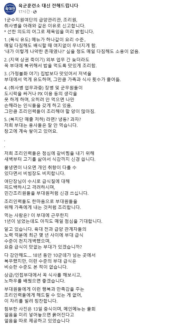 17일 페이스북 군 관련 제보 페이지 ‘육군훈련소 대신 전해드립니다’에는 1군수지원여단에서 복무하는 간부 A씨가 군대에서 제공되는 높은 수준의 급식을 칭찬하는 사연을 전했습니다.