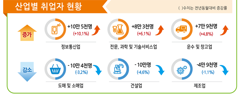 업종별로도 희비가 엇갈렸습니다. 제조업 분야는 4만9000명(-1.1%) 감소한 440만5000명을 기록했습니다. 건설업은 10만명(-1.1%)이 줄었는데 5개월 연속 감소세이자 2013년 이후 최대폭 감소입니다. 도매 및 소매업(-3.2%, -10만4000명)도 2년10개월만에 가장 많이 줄었습니다.