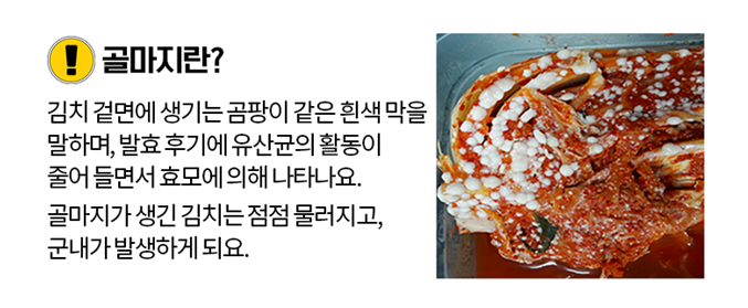 골마지는 김치 겉면에 생기는 곰팡이 같은 흰색 막을 말합니다. 발효 후기에 유산균 활동이 줄어들면서 효모에 의해 나타납니다. 골마지가 생긴 김치는 점점 물러지고 군내가 발생합니다. 김치에 곰팡이처럼 동글동글하게 생기기도 하며 흰색 막을 이루기도 합니다.