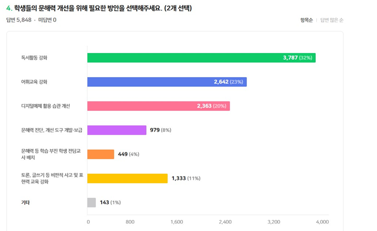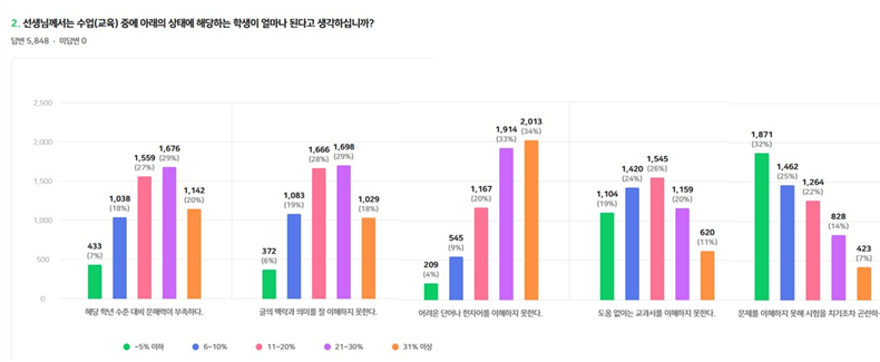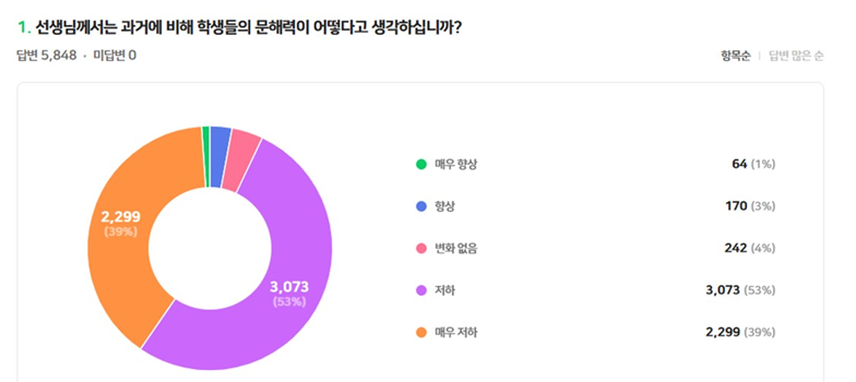 학생의 문해력이 부족해 당황하거나 난감했던 사례를 묻는 문항에는 ‘금일을 금요일로 착각’, ‘왕복 3회라고 했는데 왕복을 이해 못해’, ‘고1 학생도 혈연이 뭔지 몰라’, ‘사건의 시발점이라고 했더니 선생님이 욕하냐고 말해’, ‘체험학습 계획표 중식 안내를 보고 짜장면 먹냐고 물어’, ‘사회시간에 단어를 이해 못하는 친구가 90프로’ 등 심각한 교실 상황을 토로했습니다.