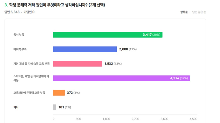 교사들은 학생 문해력 저하의 원인애 대해서는 ‘스마트폰, 게임 등 디지털 매체 과사용’(36.5%)을 1위로 꼽았습니다. 이어 ‘독서 부족’(29.2%), 어휘력 부족(17.1%), 지식 습득 교육 부족(13.1%) 순으로 나타났습니다.