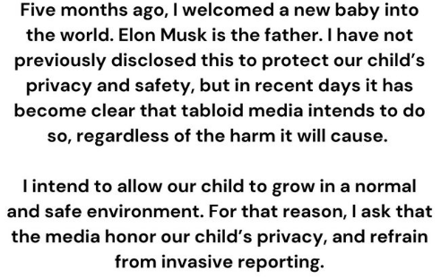 26살의 보수 성향 인플루언서 애슐리 세인트 클레어는 소셜미디어 플랫폼인 ‘엑스(X)’에 글을 올리고 “다섯 달 전 나는 새로운 아이를 맞이했는데, 아이의 아버지는 일론 머스크”라고 하면서 “지금까지는 아이의 프라이버시와 안전을 보호하기 위해 이를 공개하지 않았지만, 최근 들어 타블로이드 매체들이 이를 보도하려 한다"고 했습니다.