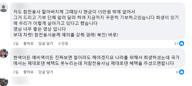영상 제보자는 “대화를 멀리서 들어보니 참전용사인 할아버지께서 전우들을 위한 성금을 모으고 계셨고, 현역인 육군 대위가 현금을 주면서 현금이 얼마 없으시다고 계좌를 물어보더라”며 “현역 군인이 참전용사께 존경을 표하는 모습이 멋지다”고 전했습니다.