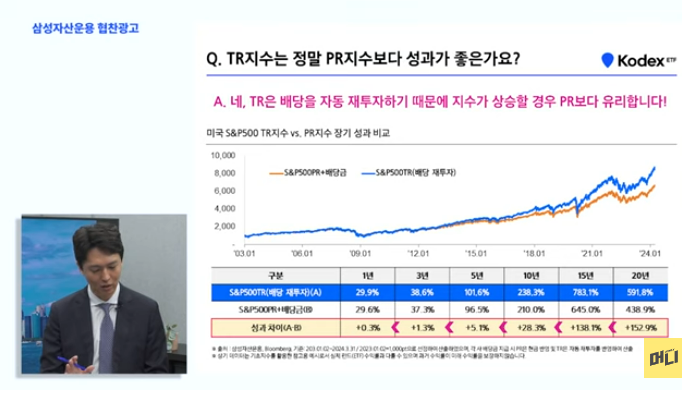 TR지수가 PR(Price return) 지수보다 성과가 좋다는 점도 강조합니다. 안 팀장은 “미국 S&P500 TR 지수에 20년 투자했을 때, 같은 기간 PR지수에 투자한 것보다 성과 차이가 152.9%나 났다”며 장기 투자할 수록 TR ETF가 유리함을 설명합니다.