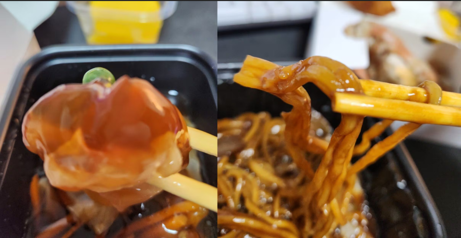 주문한 음식은 작성자의 기대와 달랐다고 합니다. 그는 "탕수육 소스가 식었다 못해 젤리로 굳어서 고기를 찍어 먹을 수도 없었다"고 주장했습니다. 이후 이 작성자는 함께 시킨 짜장면의 상태도 공개했습니다. 사진을 보면 짜장면 면발이 서로 달라붙어 뭉친 모습이었습니다.