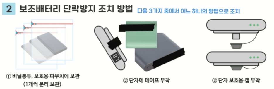 기내 반입이 허용된 보조 배터리라도 지퍼백 같은 비닐이나 파우치 등에 보관하거나, 충전 단자가 노출된 경우 절연 테이프로 가려야 합니다. 다른 물질 등과 닿는 걸 막아 화재를 방지하려는 취지입니다. 승객이 비닐 등을 준비 못 했을 경우를 위해 체크인 카운터와 기내에 합선 방지용 비닐 등을 비치할 예정입니다.