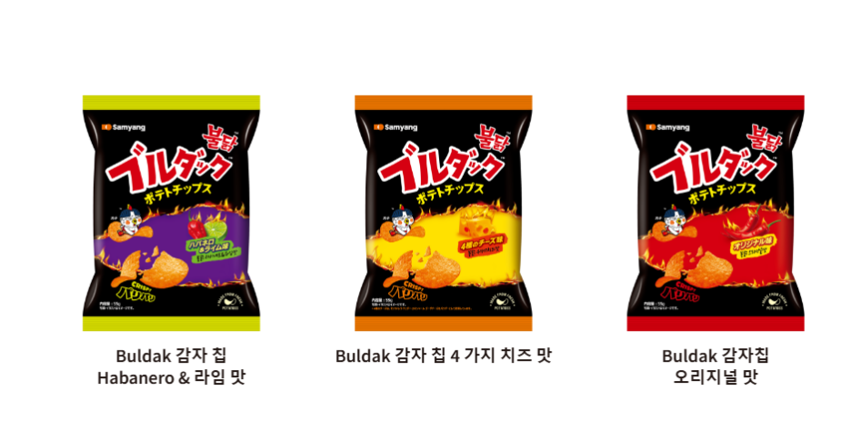 오리지널 맛은 칠리, 하바네로 등을 조합해 불닭 특유의 매운 맛을 구현했고. 4가지 치즈 맛은 모짜렐라, 체다 등 치즈 맛을 강조했으며, 하바네로&라임 맛은 산미를 느낄 수 있는 맛을 선보였습니다.