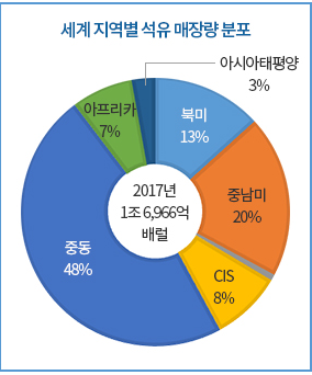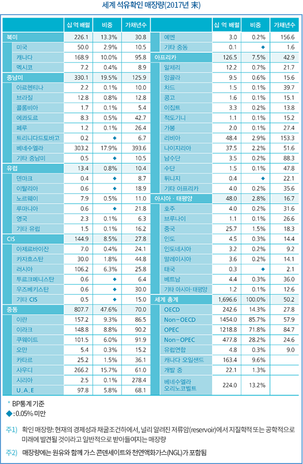 이는 현재와 같은 생산 수준으로 약50년을 생산해낼 수 있는 양이다. 확인매장량 가운데 48%가 중동지역에 분포되어 있다. 특히 사우디아라비아, 이란, 이라크, 쿠웨이트, UAE 등 빅5 산유국이 모두 중동국가이며, 이들이 전 세계 매장량의 절반 가량인 약 46%를 보유하고 있다. 반면 세계 석유소비의 약 45%를 차지하는 미국, 중국, 인도, 일본, 러시아 등 5개 국가의 매장량은 세계 총 매장량의 약 11%에 불과하다. 석유수출국기구(OPEC)은 여전히 세계 석유매장량의 약 72%를 차지하고 있어 과거에 비해 매장량 점유율이 낮아지긴 하였으나, 여전히 생산량 조절 등을 통하여 국제석유시장에서 큰 영향력을 유지하고 있다.