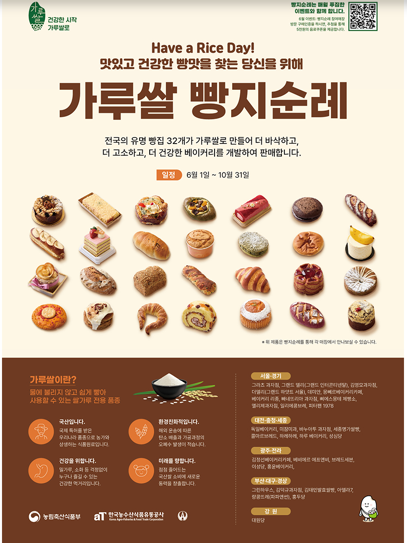 농림축산식품부는 6월1일 부터 10월 31일까지 전국 유명 빵집 32곳과 함께 빵지순례 이벤트를 한다고 밝혔습니다. 쌀 수급 안정과 식량자급률 제고를 위해 가루쌀 산업을 육성하고 있으며, 가루쌀 제과·제빵 메뉴의 개발·판촉 사업을 추진하고 있습니다.