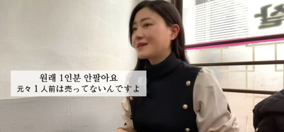 아유미가 식당에 들어가 혼자라고 하자 사장으로 추정되는 남성은 “1인분은 안 된다”고 하였습니다. 아유미가 “2인분을 달라”고 하자 남성은 “하...”라고 한숨을 쉬며 “거기 앉으라”고 하였습니다. 그러면서 “원래 1인분은 안 판다”며 불편한 기색을 내비쳤습니다.