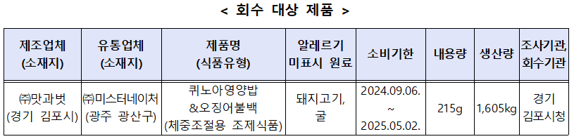 회수 대상은 알레르기 유발물질 표시대상인 ‘돼지고기’, ‘굴’이 함유된 원재료를 사용했음에도 해당 원료를 표시하지 않은 아래 제품입니다.