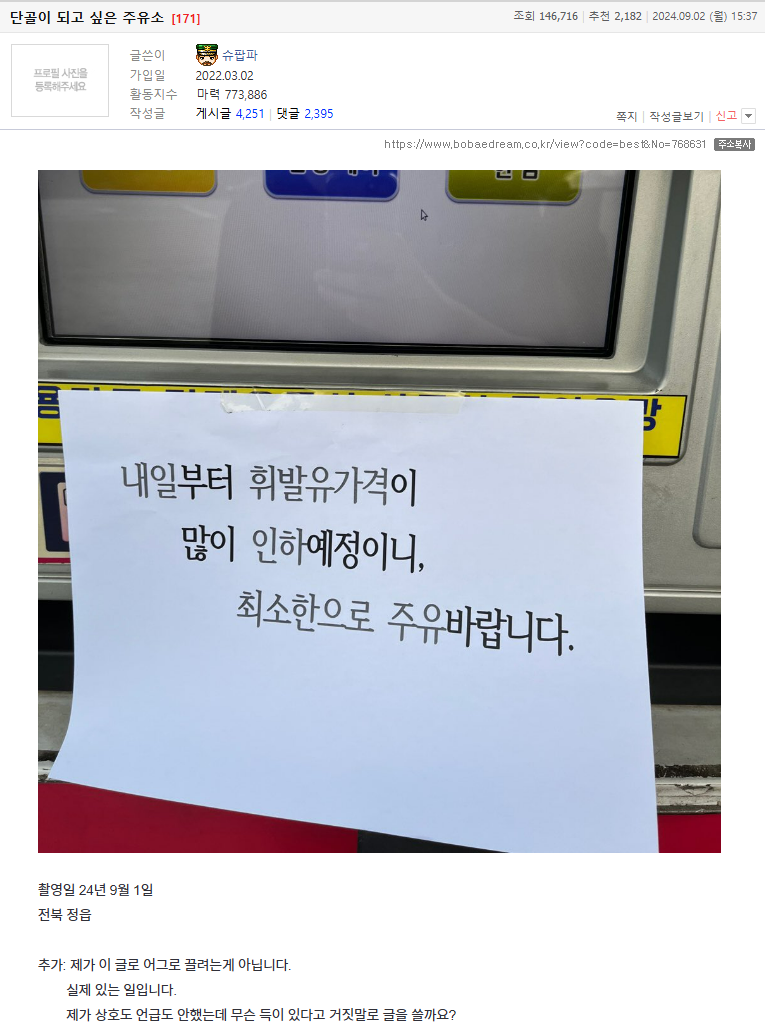 '보배드림'에 작성자 슈팝파라고 등록한 이 네티즌은 이날 ‘단골이 되고 싶은 주유소’라는 제목으로 게시물 하나를 올렸습니다. 주유기 앞에 붙은 안내문 사진이었는데 안내문에는 “내일부터 휘발유 가격이 많이 인하될 예정이니, 최소한으로 주유 바랍니다”라는 내용이 담겼습니다. 더 저렴한 가격에 휘발유를 주유할 수 있도록 고객들에게 알리는 것 입니다.
