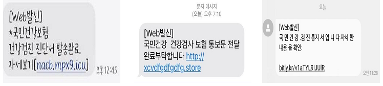 건강검진 문자 사기는 ‘국민건강보험 건강검진 진단서 발송완료’ ‘국민건강 건강검사 보험 통보문 전달 완료 부탁드립니다’ ‘국민건강 검진 통지서입니다.자세한 내용 확인' 등의 문구와 악성코드가 포함된 인터넷 주소(URL)가 첨부되어 있습니다.
