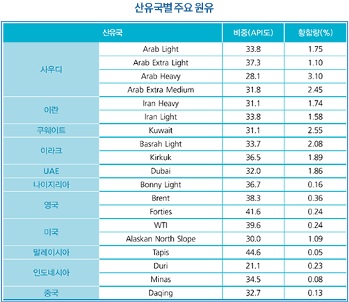 API도란 미국석유협회가 제정한 비중 표시 방식으로, 원유의 가격을 결정하는 중요한 기준이기도하다. 비중은 화씨 60도(섭씨 15.6도) 온도에서 물에 대한 석유의 무게비중을 말하며 보통 API도 30도 이하를 중질원유, API도 34도 이상을 경질원유로 분류한다. 또 하나의 원유분류기준인 황함량은 환경문제로 인해 중요시되고 있다. 원유 중 황함유율(중량%)이 1% 이하인 원유를 저유황 원유로 분류하고 2% 이상의 원유를 고유황 원유로 분류한다.