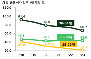 해당 연령의 여성 인구 1000명 당 출생아 수를 나타내는 모(母)의 연령별 출산율은 30대 초반이 66.7명으로 가장 높았습니다. 30대 초반과 20대 후반 출산율은 전년대비 각각 6.8명(-9.3%), 2.7명(-11.0%) 감소했고, 40대 후반 출산율은 0.0명(8.0%)으로 비슷했습니다.