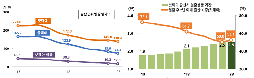 첫째아 출산시 평균 결혼생활 기간은 2.5년으로 전년과 유사했고 첫째아 중 부모 결혼 후 2년 이내에 낳는 비중은 52.1%, 전년대비 2.1%p 증가했습니다. 전년대비 모의 평균 출산 연령은 33.6세, 부의 평균 연령은 36.1세로 부모 모두 0.1세 상승했습니다.
