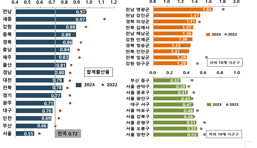 합계출산율은 전남·세종(0.97명)이 높았고, 서울(0.55명)·부산(0.66명)이 낮았습니다. 출생아 수는 충북(1.7%)을 제외한 모든 시도에서 감소, 합계출산율은 충북·전남을 제외한 15개 시도 모두 전년대비 감소했습니다.시군구별로 보면 전남 영광군(1.65명), 전남 강진군(1.47명) 순으로 높고, 부산 중구(0.32명), 서울 관악구(0.39명) 순으로 낮았습니다.