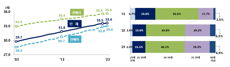 첫째아 출산연령은 33.0세, 둘째아 34.4세, 셋째아 35.6세로 전년에 비해 모두 상승했습니다. 35세 이상 산모의 비중은 36.3%로 전년대비 0.6%포인트 증가하면서 역대 가장 높은 수준을 보였습니다. 전년 대비 첫째아는 6600명(-4.6%), 둘째아는 9600명(-11.4%), 셋째아 이상은 3000명(-14.7%) 감소했습니다.
