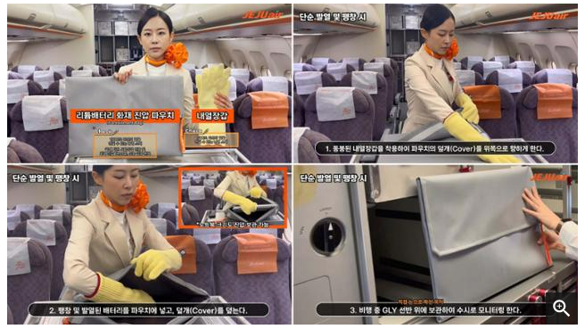 제주항공은 '리튬 배터리 화재 진압 파우치(pouch·)'와 내열 장갑을 기내에 배치하였습니다. 배터리가 팽창하거나 이미 열이 나고 있을때 파우치에 넣어두면 초기 화재에 대응할 수가 있습니다.