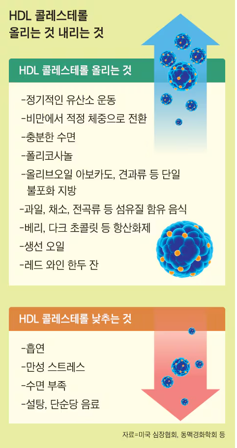 따라서 양질의 HDL-C를 높이려면 건강한 생활 습관을 갖는 게 중요하다고 합니다. 정기적인 유산소 운동과 충분한 수면, 적정 체중으로의 전환은 HDL-C를 높일 수 있다고 합니다. 쿠바산 폴리코사놀과 올리브오일, 아보카드, 견과류 등 단일불포화 지방, 과일·채소·전곡류 등 섬유질 함유 음식, 베리·다크 초콜릿 등 항산화 식품을 섭취해도 도움이 된다고 합니다. 흡연과 수면 부족, 만성 스트레스, 설탕과 단순당 음료 과다 섭취는HDL-C를 떨어뜨려 건강에 악영향을 미친다고 합니다.