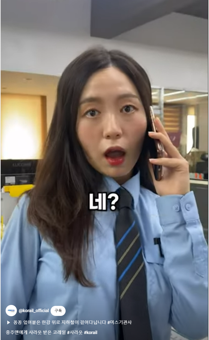 이 코믹한 영상은 진지한 문구와 대비되어 눈길을 끌었습니다. 댓글에서는 "이게 공식 영상이란게 믿겨지지 않는다"와 “충주맨이 독을 풀었다” 등의 반응이 보입니다. 코레일의 유튜브 크리에이터로 활약하고 있는 ‘미스기관사’ 강하영 주임은 이 영상을 통해 근엄한 공기업의 유튜브 홍보를 활기차게 이끌고 있습니다.