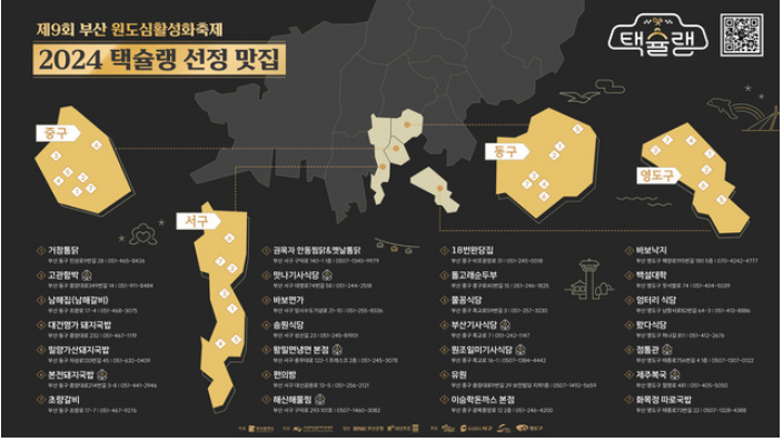 택슐랭 안내 책자는 부산문화관광축제조직위원회 누리집에서 확인할 수 있습니다. 책자에는 각 식당의 영업시간·주소·추천메뉴·추천이유 등의 정보가 담겨 있습니다.