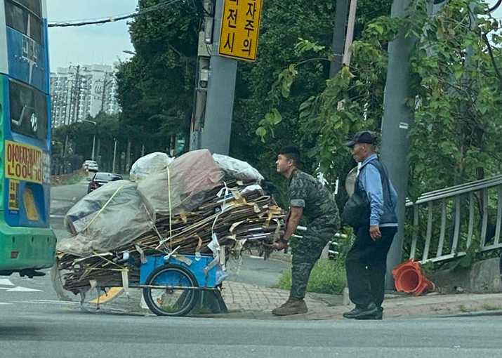 지난 1일 페이스북 ‘육군훈련소 대신 전해드립니다’에는 “미담 사례를 제보한다”는 글과 함께 사진 한 장이 올라왔습니다. 사진에는 군복을 입은 남성이 허리를 굽힌 채 폐지로 가득 쌓인 손수레를 밀고 있는 모습이 담겼습니다. 뒤에선 긴팔 차림의 노인이 남성을 바라보고 있습니다.