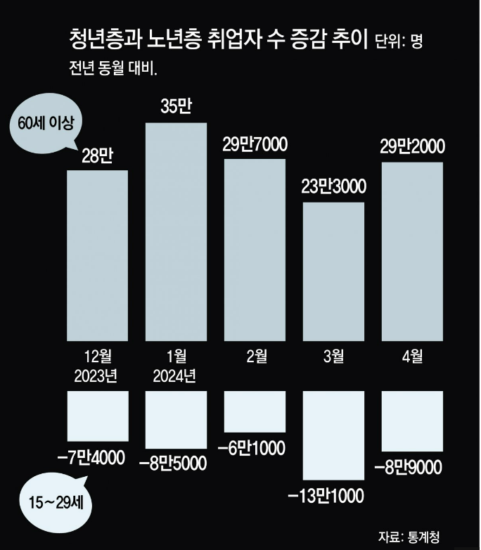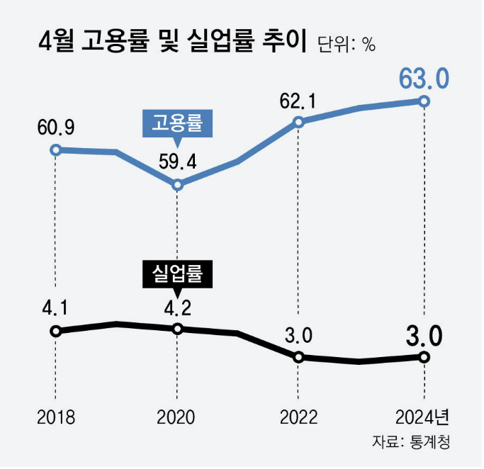 출처: 통계청 4월 고용동향 자료, 동아일보, Copilot