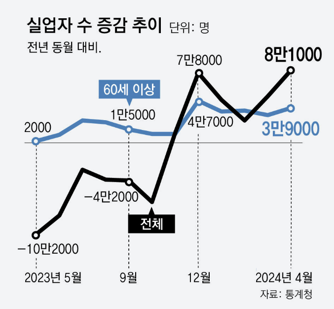 실업자 또한 고령층 위주로 늘었습니다. 지난달 총실업자는 전년 동월 대비 8만1000명 늘면서 2021년 2월(20만1000명) 이후 3년 2개월 만에 최대 증가 폭을 보였습니다.