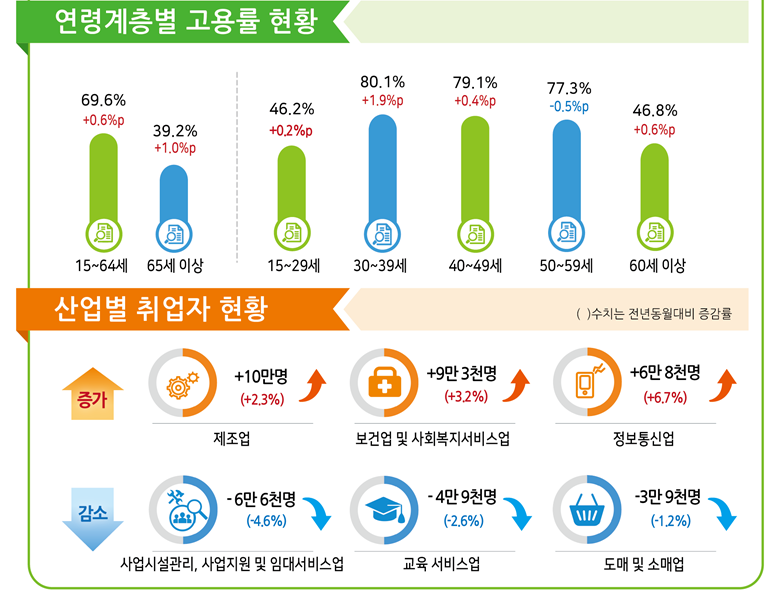 연령별로 보면 60세 이상 취업자가 1년 전보다 29만2000명 늘면서 전 연령층에서 제일 많이 증가했습니다. 반면 청년층 취업자가 8만9000명, 40대 취업자는 9만 명 줄어들었습니다. 한참 일해야 하는 청년층은 줄어들고, 정년퇴직 등으로 고용시장을 떠났던 고령층의 재취업이 늘고 있는 것입니다.