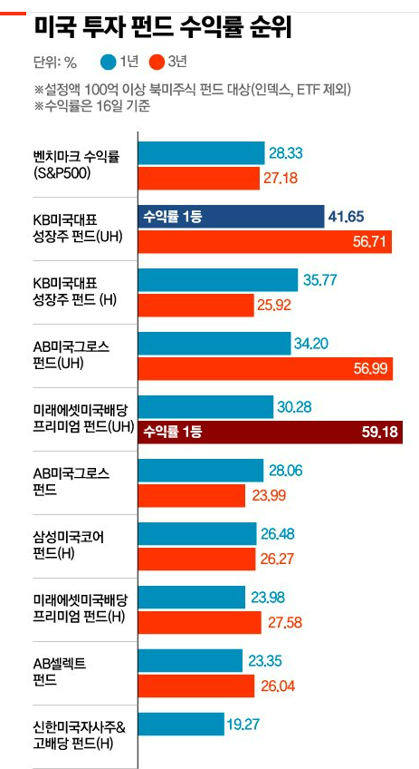 19일 금융정보업체 에프앤가이드에 따르면 북미주식펀드(설정액 100억원 이상) 중 1년 수익률 1위는 41.65% 수익을 낸 KB자산운용이 운용하는 ‘KB 미국대표성장주펀드(UH)’로 나타났습니다. 벤치마크이자 미국의 대표지수인 S&P500 보다 수익률이 1.5배가량 높았습니다. 수익률 2위도 같은 펀드 중 환노출(UH) 대신 환헤지(H) 전략을 쓴 상품이었고, 장기(3년) 수익률로 봐도 미래에셋자산운용의 ‘미래에셋미국배당프리미엄펀드(UH)’가 1위를 차지했습니다.