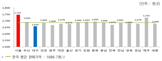 지역별 판매 가격은 휘발유 기준 최고가 지역은 서울의 판매가격이 전주대비 17.6원 상승한 1747.2원/ℓ으로 전국 평균 가격 대비 60.5원 높은 수준이며, 최저가 지역은 대구의 판매가격운 전주대비 15.5원 상승한 1658.6원/ℓ으로 전국 평균 가격 대비 28.1원 낮은 수준입니다.