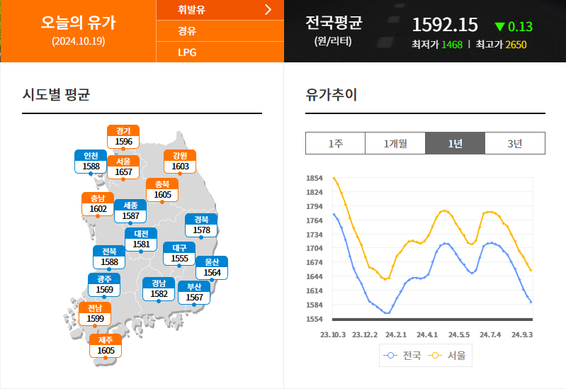 10월 19일현재 기준 전국 주유소 휘발유 평균 판매가는 L당 1592.15원을 기록했습니다. 경유 판매가는 L당 1421.56원입니다. 7월 넷째 주 이후 11주 연속 동반 하락세입니다. 올 초 휘발유 가격이 한때 L당 1700원대를 찍고, 상당 기간 1600원대에 머무른 데 비하면 상당히 낮은 가격입니다.
