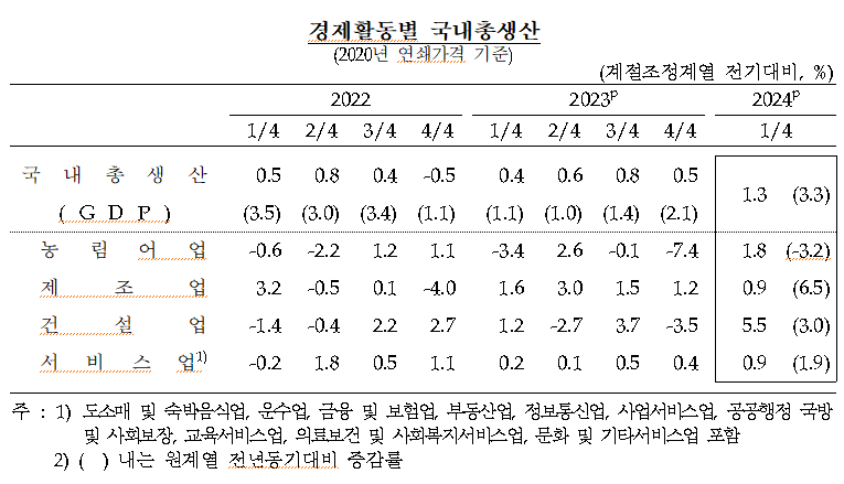 2024년 1/4분기 한국의 실질 국내총생산(GDP)은 전기 대비 1.3% (명목 국내총생산은 3.0% 성장) 성장했습니다.