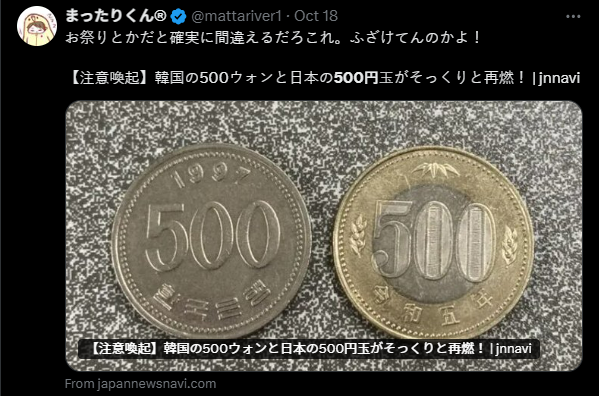 이 때문에 일본에선 과거에도 500원을 500엔 대신 악용한 사례가 발생해 1997년 일본 경찰이 500원 동전 1만 4000개를 압수한 적도 있었습니다.