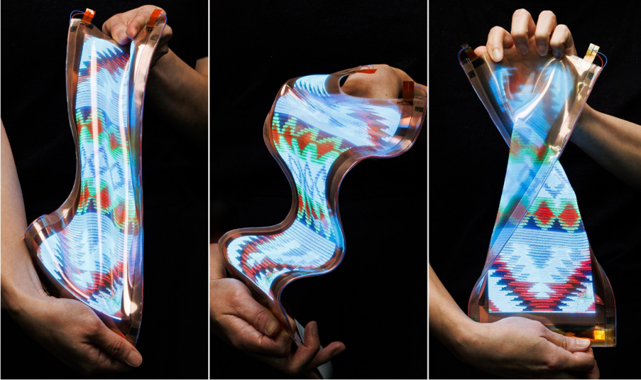 스트레처블(stretchable) 디스플레이는 실리콘 소재를 활용해 얇고 가벼우면서도 자유롭게 변형이 가능하다고 합니다. 고무처럼 늘이거나 접고 비틀어도 원래 모습으로 되돌아갑니다.