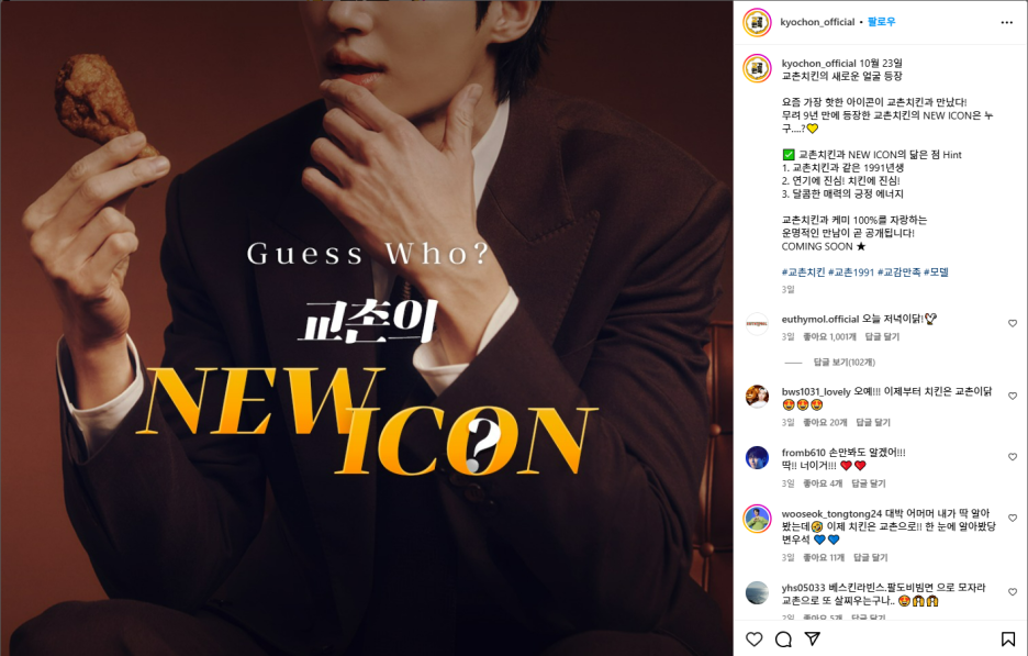 교촌치킨 인스타그램에는 “10월 23일 교촌치킨의 새로운 얼굴 등장”이라며 “요즘 가장 핫한 아이콘이 교촌치킨과 만났다. 무려 9년 만에 등장한 교촌치킨의 NEW ICON은 누구”라고 적혀 있습니다.