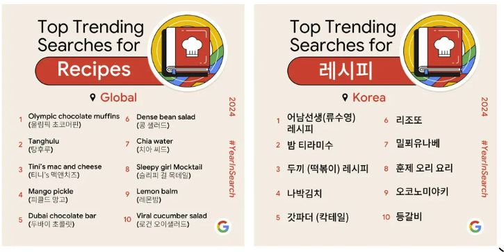 이번 2024년 리스트에는 K-콘텐츠, K-POP, 요리법, 도서, 영화, 스포츠 매치, 인공지능(AI) 툴 등 총 9가지 카테고리의 상위 10개 검색어가 포함되었습니다. 특히 올해에도 글로벌 검색어 리스트 중 두 가지 부문에서 한국 관련 검색어가 순위에 올랐습니다.