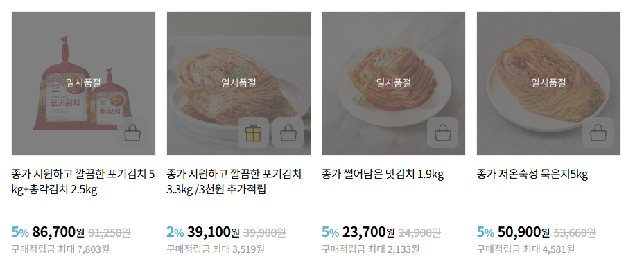 이들 기업의 자체 온라인몰에서는 배추김치 상품이 며칠째 일시품절을 기록하고 있습니다. 대상 온라인몰(정원e샵)에서 소포장 160g 맛김치 2종을 제외한 배추김치 상품 36종이 모두 품절입니다. CJ제일제당의 온라인몰(CJ더마켓)에서도 배추·포기김치 29종 가운데 15종이 구매 불가입니다.