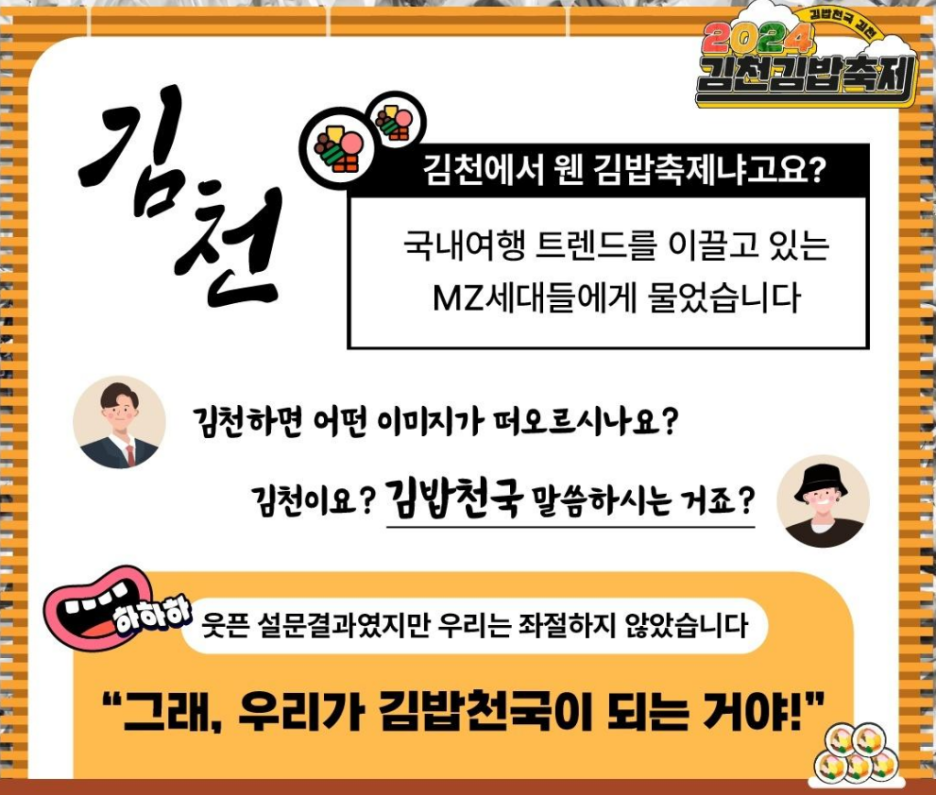 축제에 앞서 시는 관광 트렌드를 이끄는 MZ세대를 대상으로 김천 하면 떠오르는 이미지가 무엇이냐는 질문에 ‘김밥천국’이라는 답변을 받았다고 합니다. 이런 ‘웃픈(웃기지만 슬픈)’ 오해를 이용해 ‘김밥’을 주제로 한 축제를 기획하게 되었다고 합니다.