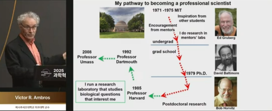 그가 노벨상을 수상하게 된 결정적 순간도 동료들과의 협력에서 비롯되었다고 합니다. 앰브로스 교수는 1992년, 개리 러브킨이 속한 연구실과 경쟁 관계였지만, 경쟁보다는 협력을 선택했다면서 각 연구실에서 얻은 데이터를 공유한 덕분에 중요한 과학적 발견을 할 수 있었다고 회상했습니다.