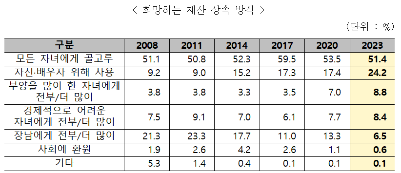 재산을 자신과 배우자를 위해 쓰겠다’는 응답은 24.2%로 2020년 17.4% 보다 6.8%포인트 늘었습니다. 반면 ‘장남에게 더 주겠다’는 비율은 13.3%에서 6.5%로 반 토막이 났습니다. 베이비붐 세대는 재산을 상속하기보다 본인들이 더 사용하고 대신 자녀에게 부담을 주지 않겠다는 가치관을 가진 것으로 보입니다.